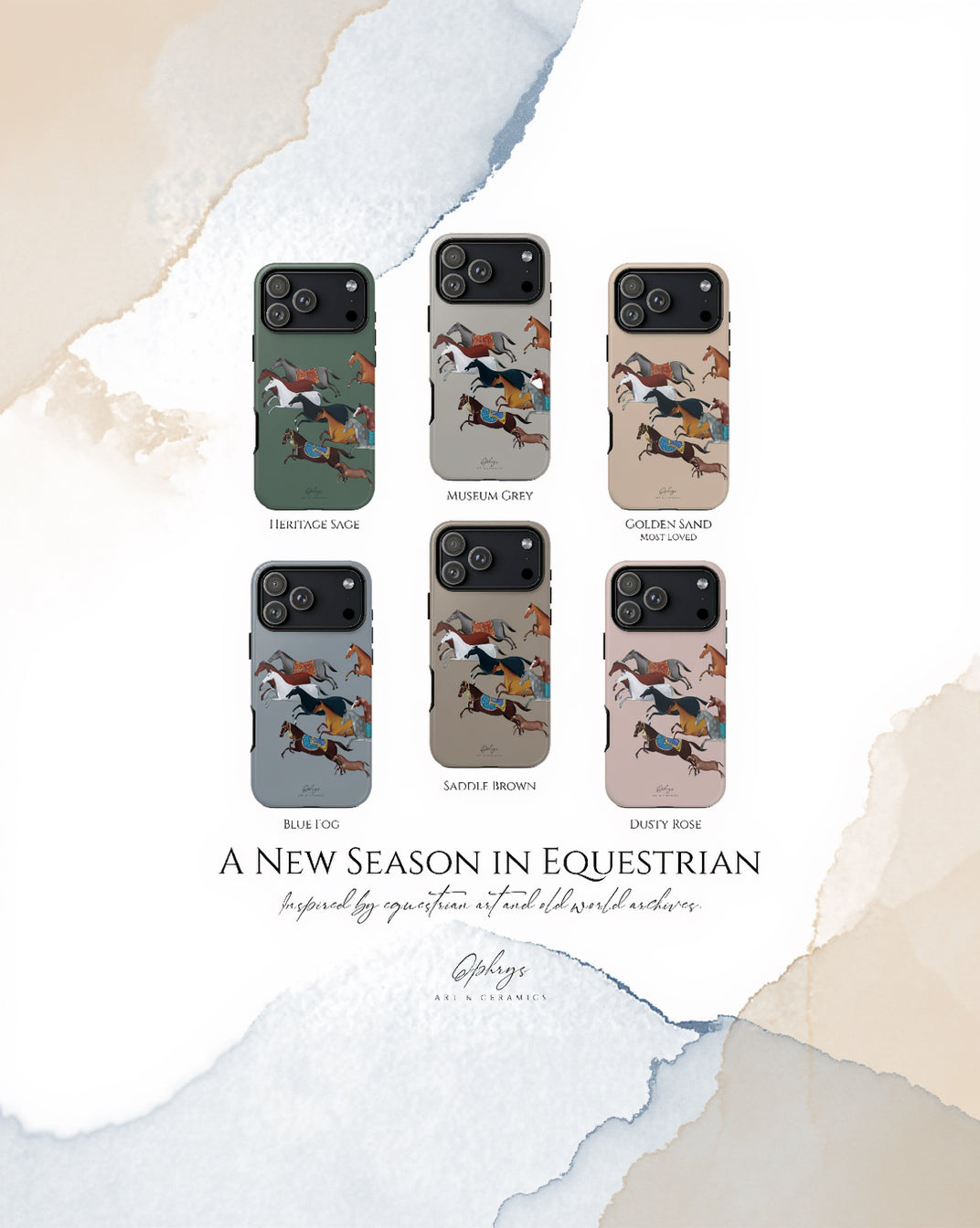A curated collection of hand-painted ceramic pieces inspired by historical equestrian imagery and manuscript illustrations.